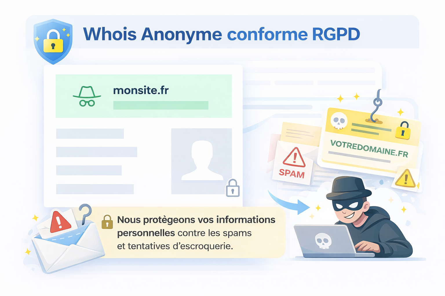 Cela garantit au maximum la confidentialité de vos informations dans les outils Whois officiels et respecte strictement le RGPD (Règlement Général sur la Protection des Données).